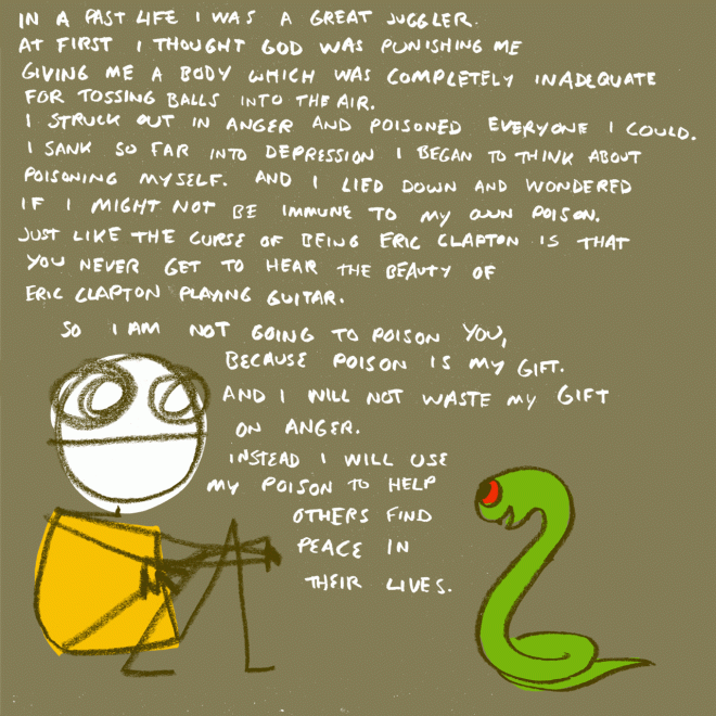 August 15, 2011 by Sineokov In a past life I was a great juggler — explodingdog Rate this:Share this: Email a link to a friend (Opens in new window) Email Share on Facebook (Opens in new window) Facebook Share on X (Opens in new window) X Share on Reddit (Opens in new window) Reddit Print (Opens in new window) Print Like Loading... Related