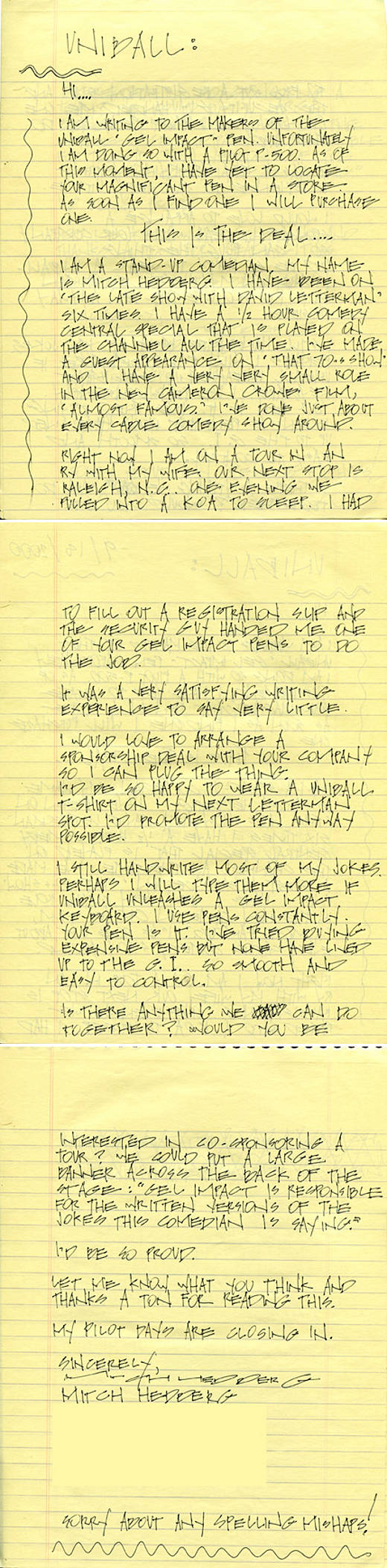 I WOULD LOVE TO ARRANGE A SPONSORSHIP DEAL WITH YOUR COMPANY SO I CAN PLUG THE THING. I’D BE SO HAPPY TO WEAR A UNIBALL T-SHIRT ON MY NEXT LETTERMAN SPOT. I’D PROMOTE THE PEN ANYWAY POSSIBLE.