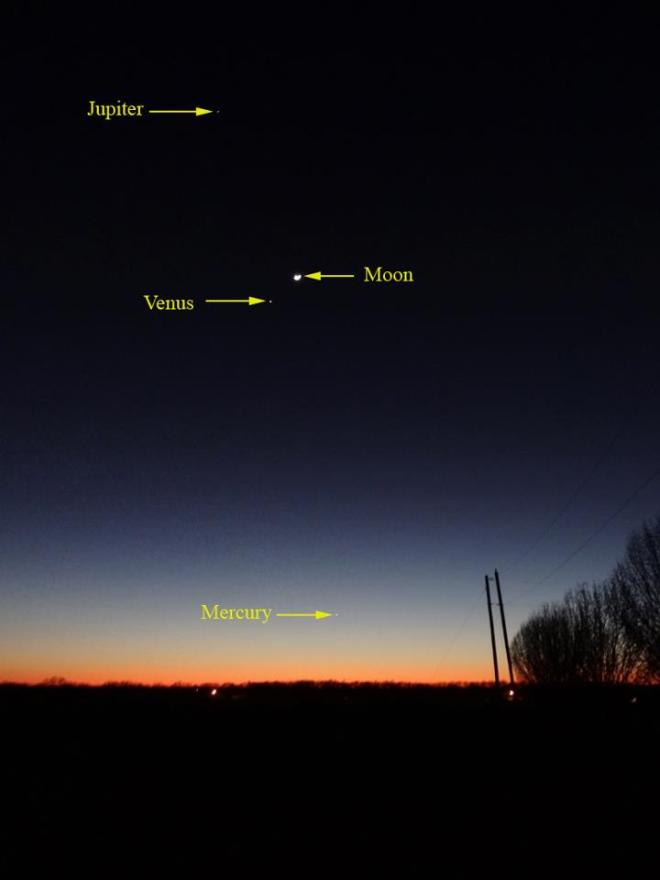 Here is the subtle but magnificent scene in the evening sky tonight from Scatterbranch, TX. The labels were added after the fact to help you navigate. Get outside and look! Tomorrow night the moon will be right next to Jupiter. Notice that the three planets all form a straight line – that is the plane of our solar system. Earth’s Moon formed after the rest of this stuff and its orbit is slightly different. Which is why it is not “lined up” with the rest.