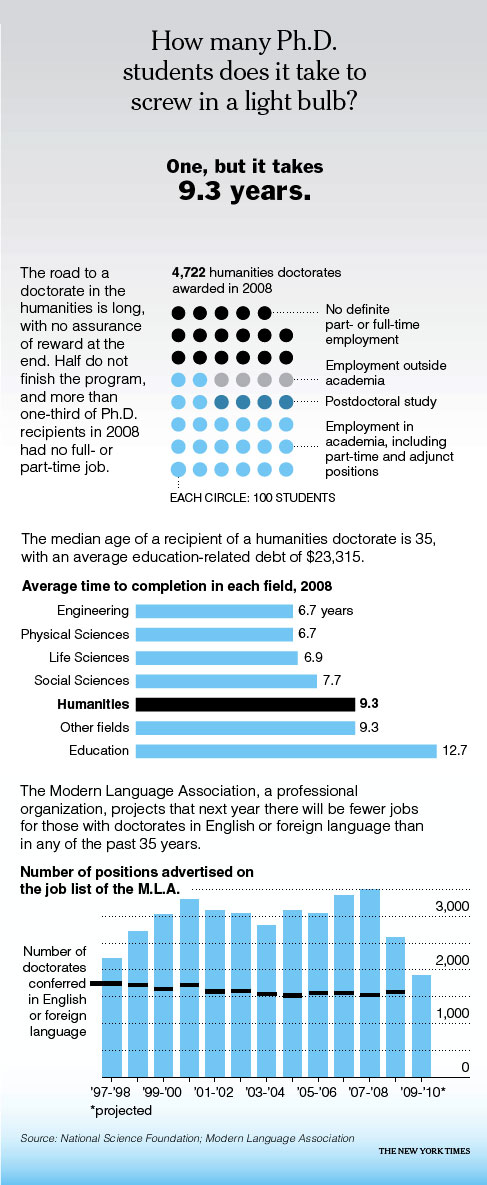 In the United States, given that most students take time off, nearly a dozen years can pass between receiving a B.A. and Ph.D. About half who enter a humanities doctoral program drop out along the way. The average student receiving a Ph.D. today is 35 years old, $23,000 in debt and facing a historically bad job market. Adjunct jobs — with year-to-year contracts, no benefits and no security — may be the only option.